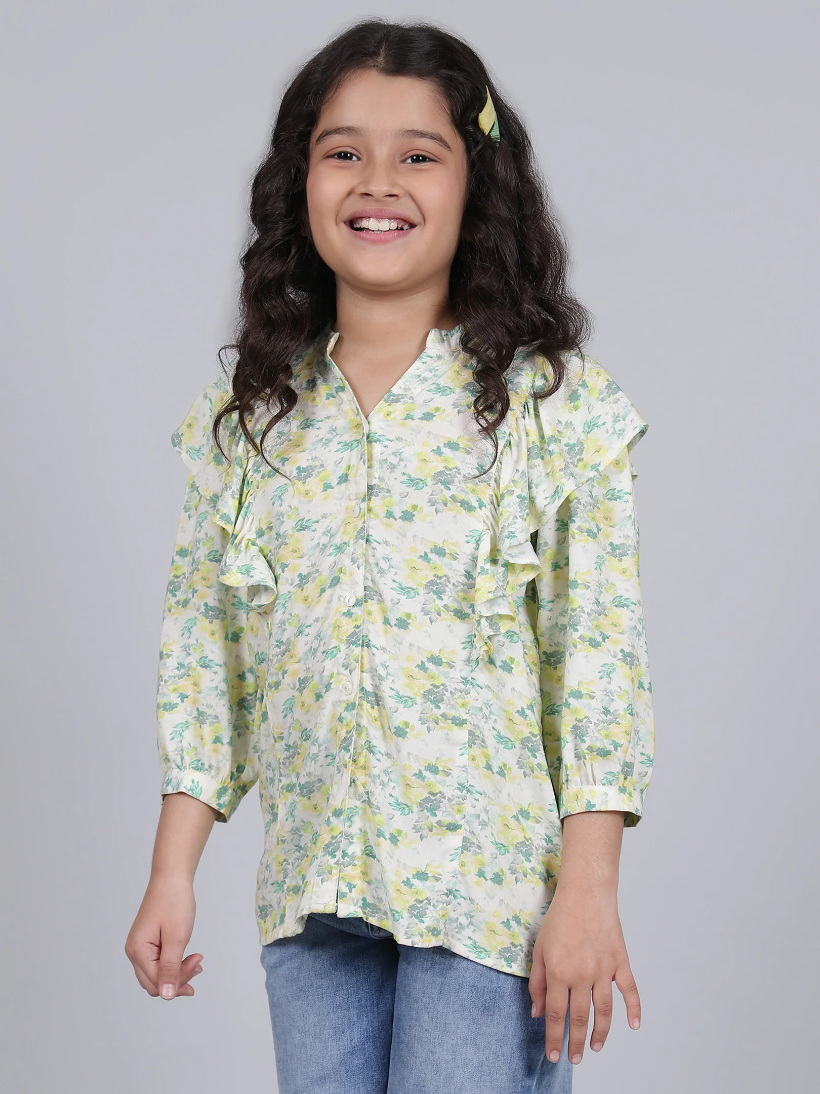 Girls Printed Green V-Neck 3/4th Sleeves Casual Top