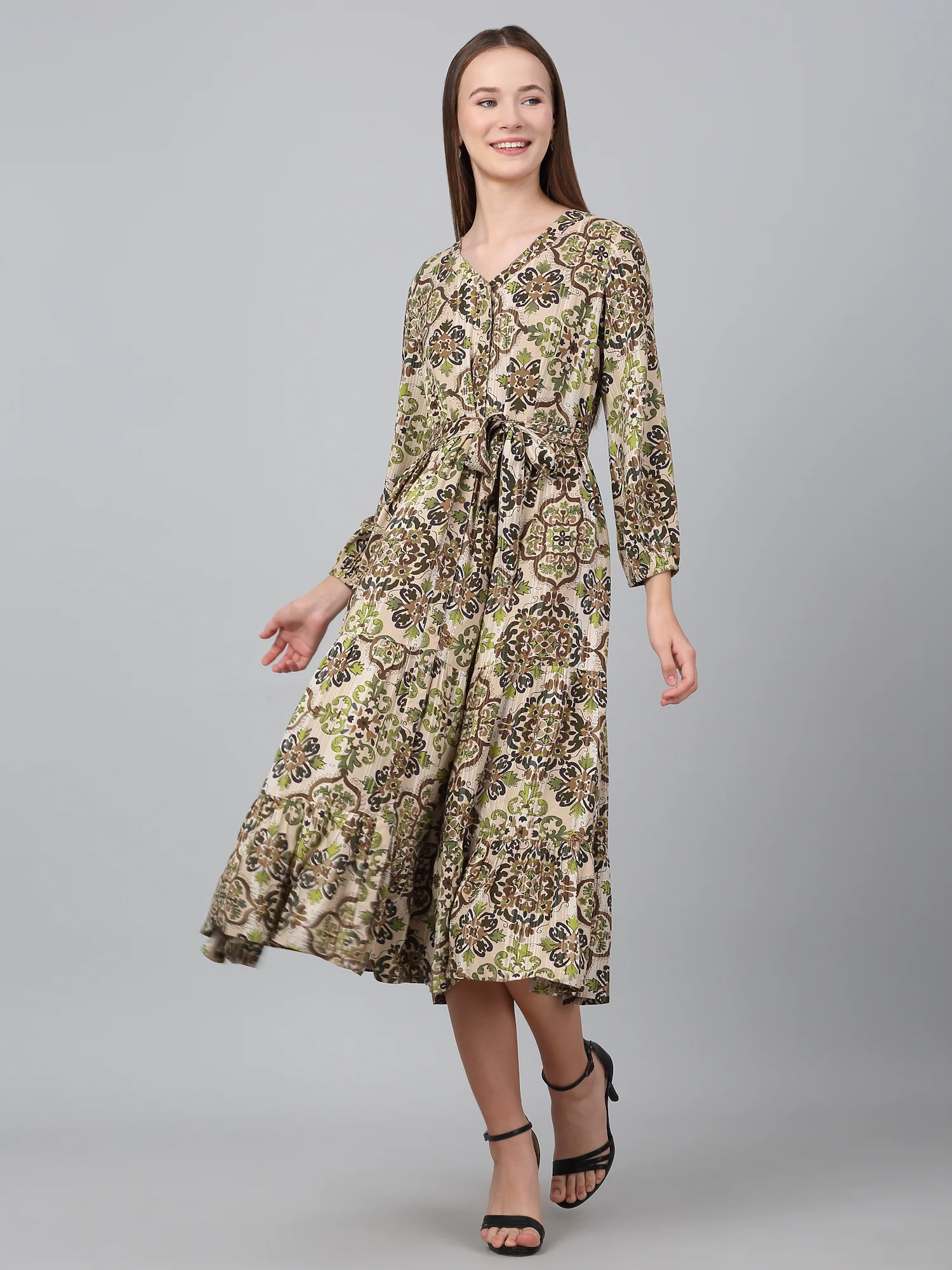 | Level Up your dress wardrobe with our Brown color dress. This summer dress is made up of finest Rayon fabric material. It Printed dress, V- Neck, Calf Length, 3/4th sleeves & Flared & Fit dress. Perfect for any occasion, our dresses are your go-to for creating memorable looks with best of fashion. Durable, breathable & easy to maintain. |