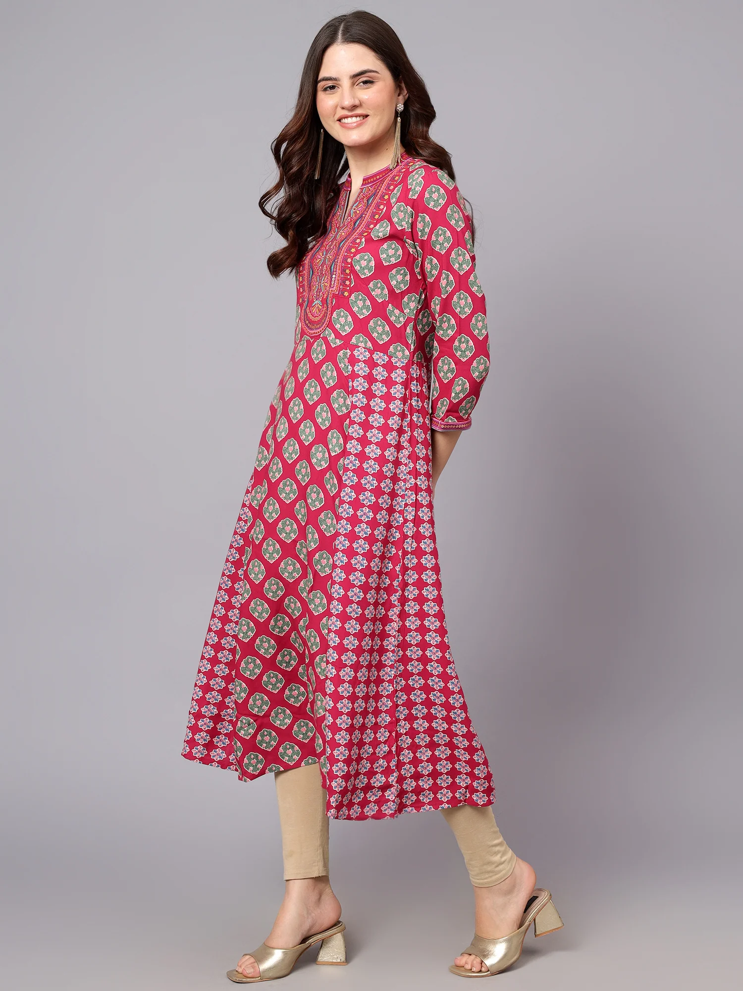 Women's Dark-Pink Floral Printed Band Collar Regular Fit 3/4 Sleeves Kurti