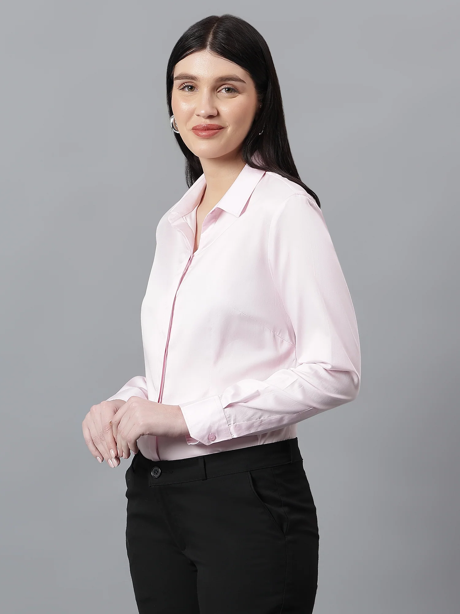 Buy women’s pink solid spread collar formal shirt with full sleeves. Stylish workwear design offering comfort, durability, and elegance.